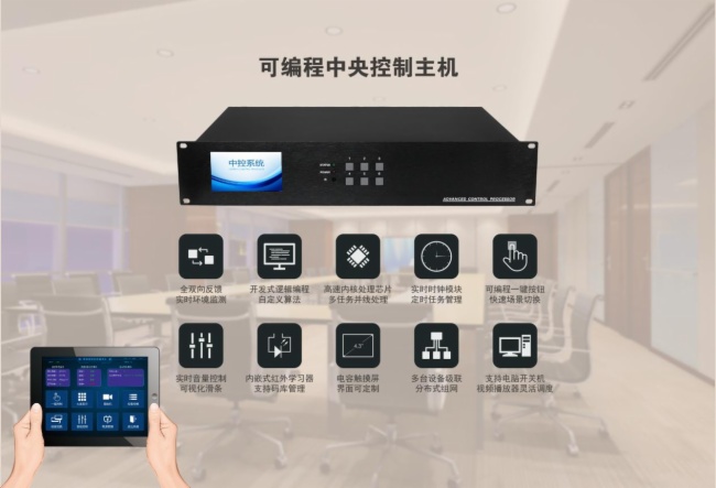 因为所有的设备都接入中控主机进行了接口和协议转换,所以通过中控主机内核芯片强大的可编 程逻辑处理算法,可以根据客户的现场应用需求对各个设备进行编程控制;对视频、音频、灯光、 影音等设备进行预设及调整;根据需求设计场景模式,一键式完成对整个控制区域的音视频设备 控制,以自动适应当前的会场需求,如:会议前模式、会议模式、会议结束模式等。