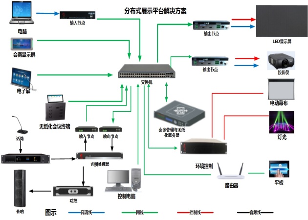 为了满足各种各样的应用需求,引申出千姿百态的各种系统,大屏分布式有拼接屏、编码器、解码器、服务器、控制终端、音频设备等;无纸化会议有会议拼接屏、会议电子白板系统、会议室电子门牌系统、会议信息播报系统、侯会室语音播报系统、会议引导系统等;多媒体共享发布有拼接屏、全彩屏、服务器等。往往使用单位在建设时,仅仅为了引进更好的信息化技术、实现更灵活的配置需求、解决基础的业务工作而缺乏统一规划和标准,所以多系统很难一次建设成型。最终导致各类应用孤立运行,信息化建设各自为阵,数据散乱且不共享互联,以上建设模式导致的问题时常发生且一旦建设很难再次互融打通。