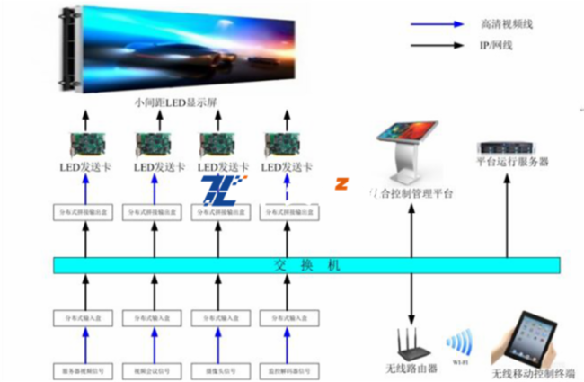 分布式系统支持多种类型信号输入和输出,例如常见的HDMI信号, DVI信号,VGA信号等等,超强的信号类型兼容能力使该系统具备异常强大的信号切换功能。该系统采用的网络数据流传输技术,因此在信号切换过程快速平滑,无黑屏画面出现,满足未来的需求。使用时,只需在已经编写好控制程序的ipad、windows等平板上操作即可把各种不同的信号如dvd、手提电脑、摄像机、远端画面等等这些信号切换到拼接大屏、远程终端上。