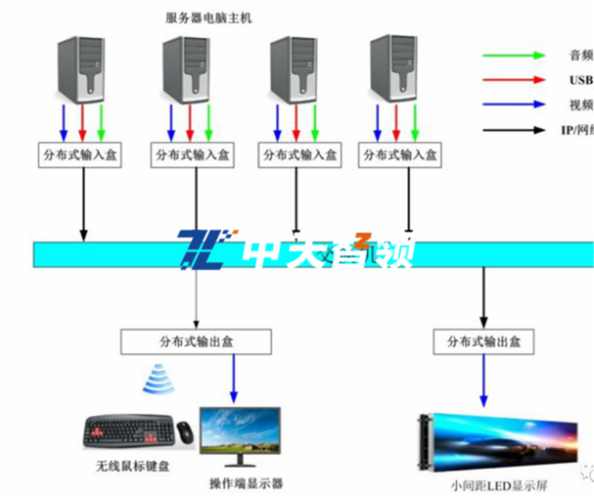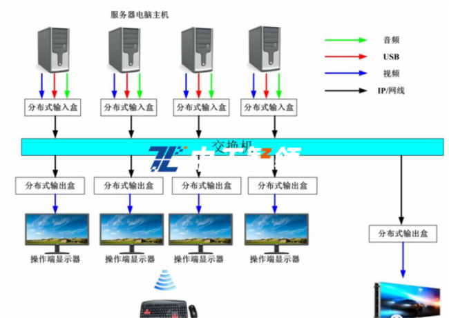 可实现一套鼠标键盘控制多个操作显示器,可实现鼠标跨屏,跨屏复制粘贴,拷贝等功能并可切换视频至LED大屏显示