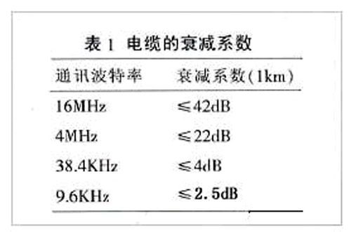 导线的电阻对信号的影响很小,可以忽略不计。电缆的分布电容C主要是由双绞线的两条平行导线产生。信号的损失主要是由于电缆的分布电容和分布电感组成的LC低通滤波器。通讯波特率越高,信号衰减也会越大。常规电缆的衰减系数见表1。