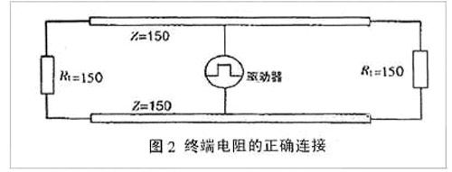 ②阻抗不连续。顾名思义,与光从一种媒质进入另一种媒质时所引起的反射是相似的。信号在传输线末端突然遇到电缆阻抗很小甚至没有,信号在这个地方就会引起反射。消除这种反射最常用的方法,是在电缆的末端跨接一个与电缆的特性阻抗同样大小的终端电阻,使电缆的阻抗连续。由于信号在电缆上的传输是双向的,因此,在通讯电缆的另一端同样要跨接一个相同大小的终端电阻,如图2所示。